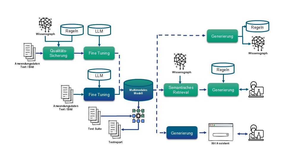 Neue Methoden erklärbarer KI (XAI) dienen der multimodalen dialogischen Erklärbarkeit sowie neuro-symbolische Ansätze der transparenten Quellen-Attribution und faktischen Validierung generierter Texte. Zur Validierung und Prüfung existierender Modelle werden domänenspezifische Contrast- bzw. Challenge-Sets entwickelt, die kritische Fälle in realen Anwendungsszenarien prüfen.